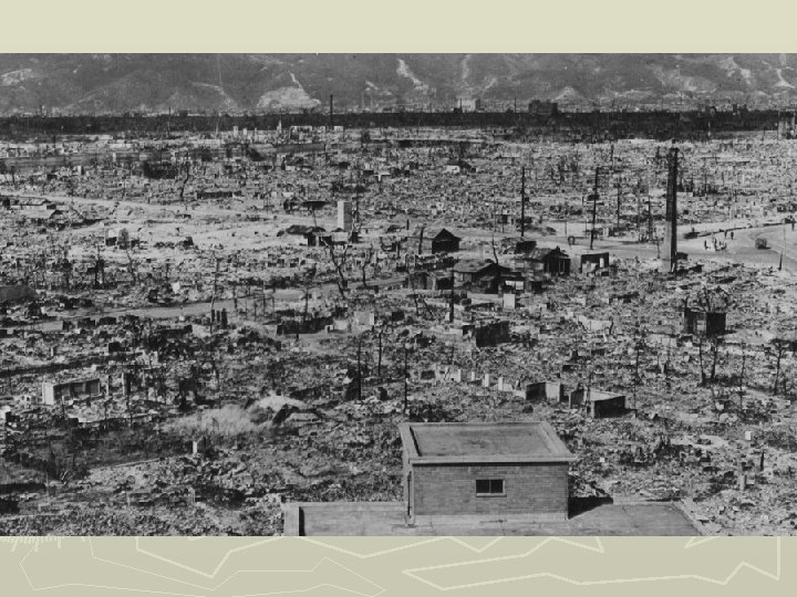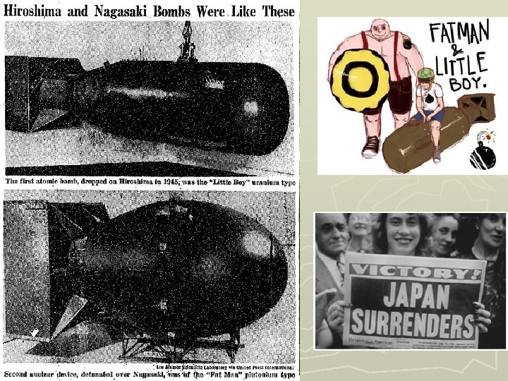 2 Atomic Bombs dropped ► Hiroshima (Aug, 6 th, 1945) § Important Jap. military center § Enola Gay (plane) § Little Boy (atomic bomb) ► Every building in the city collapsed in 1 minute § Emperor Hirohito didn’t surrender ► Nagasaki (Aug, 9 th, 1945) § Bockscar (plane) § Fat Man (atomic bomb) ► Did less damage § half of city destroyed § due to topography