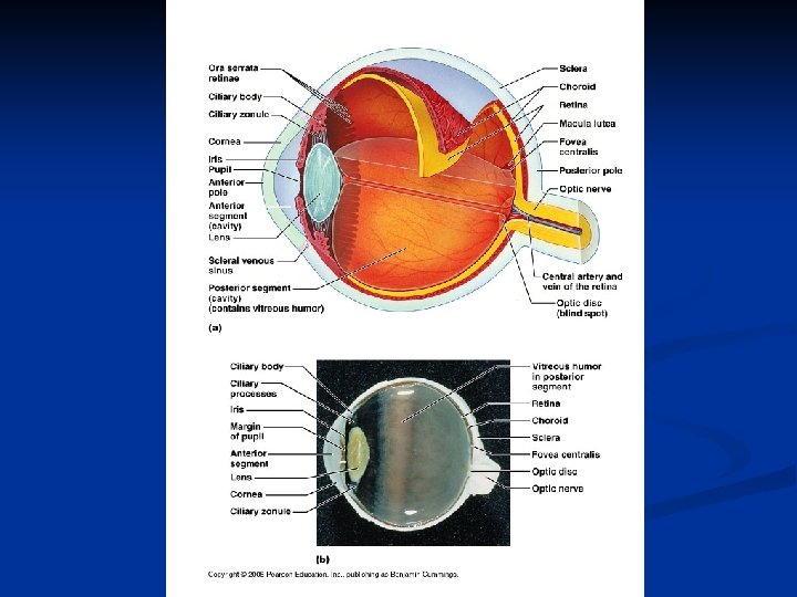 The LENS n n n Defined: composed of proteins called crystallins arranged in layers much like an onion. It is completely transparent and lacks any blood vessels. Attachments: Lens is enclosed in a clear connective tissue capsule and is held in place by encircling zonular fibers which attach it to the ciliary processes. Lens divides the eye into two cavities: n anterior chamber – lies between the cornea and iris - is filled with aqueous humor a watery fluid that nourishes the lens and cornea. n posterior chamber – lies between the iris and in front of