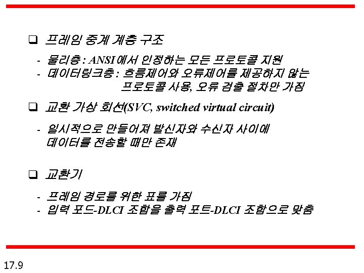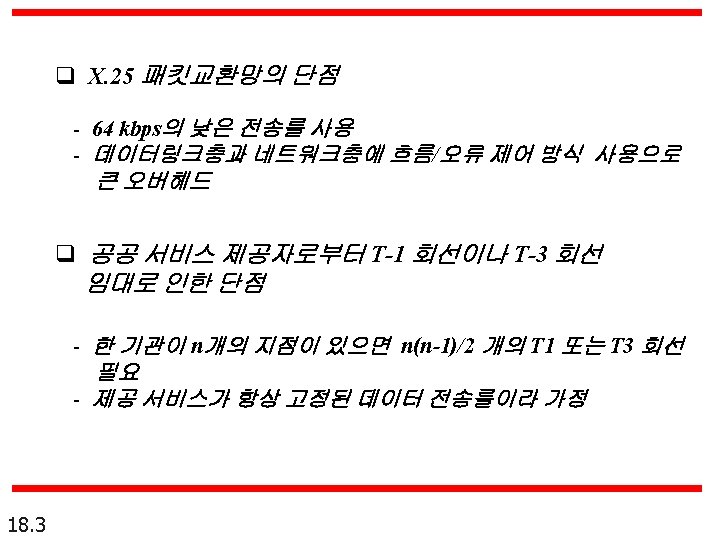 프레임 중계는 흐름 제어 또는 오류 제어를 제공하지 않는다. 이들은 반드시 상위계층 프로토콜에서 제공되어야만 한다. Frame Relay does not provide flow or error control; they must be provided by the upper-layer protocols. 18. 12
