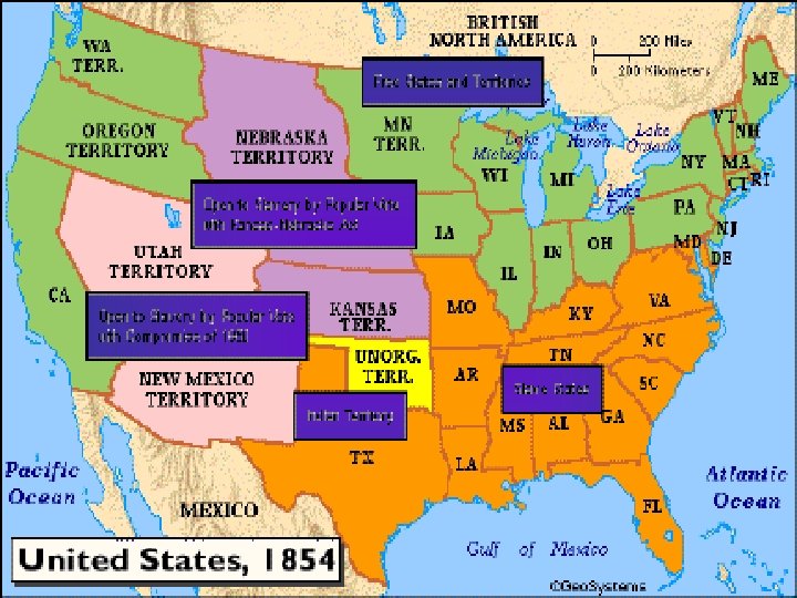 Kansas-Nebraska Act 1854 • Most important short term cause of the Civil War • Stephen Douglas proposed splitting Nebraska territory into two states: Kansas and Nebraska – Slavery issue would be based on popular sovereignty – Kansas would probably be slave, Nebraska free • Problems – – 36 -30 line created by Compromise of 1820 prohibited slavery Kansas was above it Solution? Repeal Compromise of 1820 Fully supported by Southerners