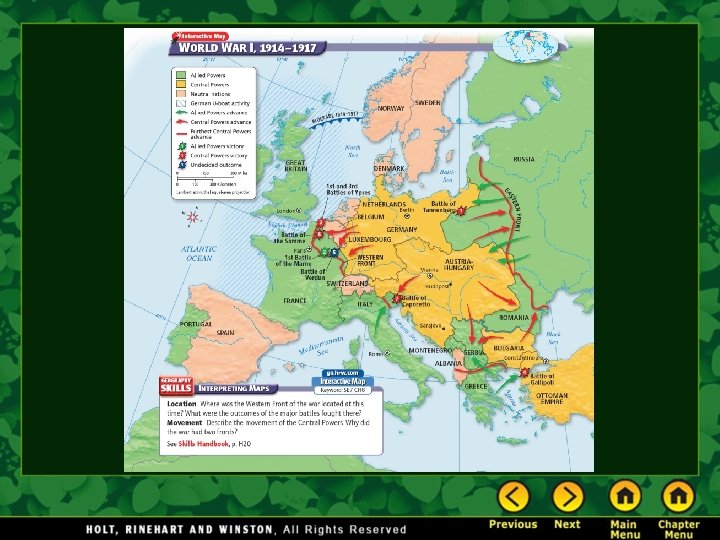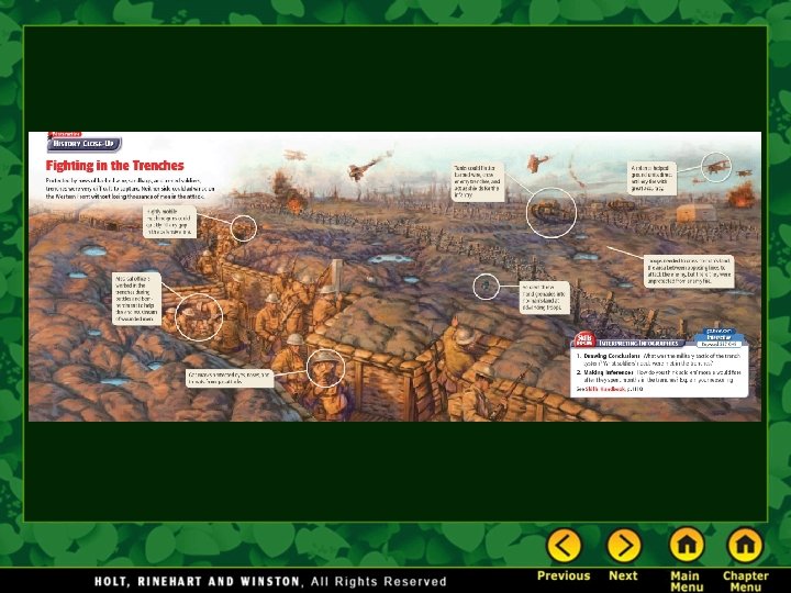 The War Reaches a Stalemate • The First Battle of the Marne ended in a stalemate, and both French and German soldiers dug trenches, or deep ditches, to defend their positions and seek shelter from enemy fire. • By late 1914, two massive systems of trenches stretched 400 miles across Western Europe, and the battle lines known as the Western Front extended from Switzerland to the North Sea. • Trench warfare, or fighting from trenches, was an old strategy that had been used in Africa, Asia, and the Americas. • This trench warfare, however, was different because of its scale. – Soldiers lived in trenches, surrounded by machine-gun fire, flying grenades, and exploding artillery shells. – Opposing forces had machine guns pointed at enemy trenches at all times, firing whenever a helmet or rifle appeared over the top. – Thousands of men that ran into the area between the trenches, known as “no-man’s-land, ” were chopped down by enemy fire. • Neither the Allies nor the Germans were able to make significant advances, creating a stalemate, or deadlock.
