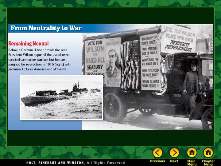 The United States Stays Neutral • Americans thought of World War I as a European conflict with little effect on their country. • Just after the war broke out, President Wilson declared that the U. S. would stay neutral. • Wilson’s decision reflected the U. S. ’s longstanding policy of isolationism, or not being involved in foreign affairs. • Privately, Wilson favored the Allied cause because Germany's tactics and invasion of Belgium was worrisome. – The U. S. also had greater political, cultural, and commercial ties to Great Britain and France than to Germany. • Financially, the U. S. did more business with the Allies. – The British fleet blockaded German ports and transportation routes, and few American businesses could sell goods to German forces. – Doing business with the Allies was easier, and by 1917 Britain purchased nearly $75 million worth of war goods each week.