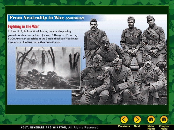 The United States in World War I The Main Idea The United States helped turn the tide for an Allied victory. Reading Focus • Why did the United States try to stay neutral in the war? • Which events showed that America was heading into war? • What contributions did Americans make in Europe? • How did the war end?
