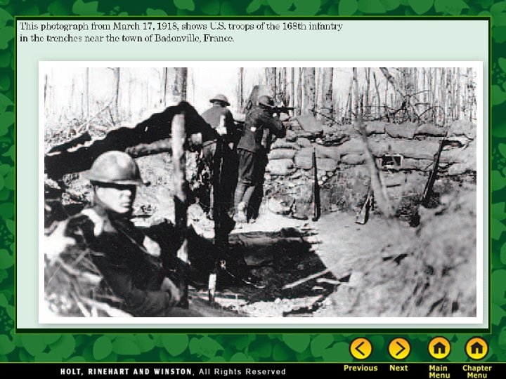Allied Setbacks and U. S. Action Allied Setbacks • While Americans trained, the Allies suffered a blow when a group called the Bolsheviks took over Russia’s government. • Bolsheviks were Communists, who seek equal distribution of wealth and no private ownership. • The new government, led by Vladimir Ilich Lenin, signed a peace treaty with the Central Powers and withdrew its troops. • Germany was free to focus on the West, and in May 1918 Germany launched a series of offensives against the Allies. • Germans were backed by a large artillery, and by late May the Germans pushed the Allies back to the Marne River, 70 miles northeast of Paris. The U. S. Fights • American troops began fighting 12 months after arriving, digging extensive trenches in the dark to avoid detection. • In the trenches, troops stood in deep mud with rats as enemies dropped gas and explosives. • While defending Paris in June 1918, U. S. troops helped the French stop the Germans at Chateau-Thierry. • In northern France, a division of U. S. Marines recaptured the forest of Belleau Wood and two nearby villages. • After fierce fighting, the Allies halted the German advance and saved Paris.