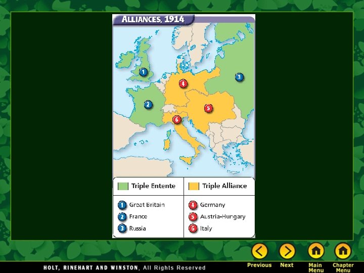 Alliances • Nations formed alliances, or partnerships, for protection. • Alliances were formed to maintain peace but would lead directly to war. • Germany formed a military alliance with Austria-Hungary and Italy called the Triple Alliance. • Fearful of Germany’s growing power, France and Russia formed a secret alliance with each other. • Great Britain, also worried, joined France and Russia to form the Triple Entente. • Some European leaders believed that these alliances created a balance of power, in which each nation had equal strength, therefore decreasing the chance of war. • Archduke Ferdinand’s assassination exposed flaws in this thinking, as after this attack Europe exploded into war.