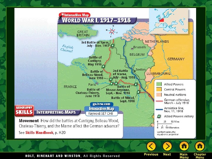 The War Ends The Germans’ Last Offensive • At midnight on July 14, 1918, the Germans launched their last offensive at the Second Battle of the Marne. • U. S. blew up every bridge the Germans built across the Marne River, and the German army retreated on August 3, after suffering 150, 000 casualties. • The Allies began a counterattack in September 1918 and, fighting as a separate army for the first time, defeated German troops at Mihiel, near the French-German border. Allies Push Forward • Allies continued their advance toward the French city of Sedan on the Belgian border, which held the main German supply railway. • By November, the Allies had reached and occupied the hills around Sedan. The Armistice • By 1918 the war crippled the German economy, causing food strikes and riots, and revolution swept across Austria-Hungary. • The Central Powers lacked the will to continue and started to surrender. • Austria-Hungary, and then Germany, surrendered, and the Allies demanded that Germany surrender its weapons and allow Allied occupation of some areas.