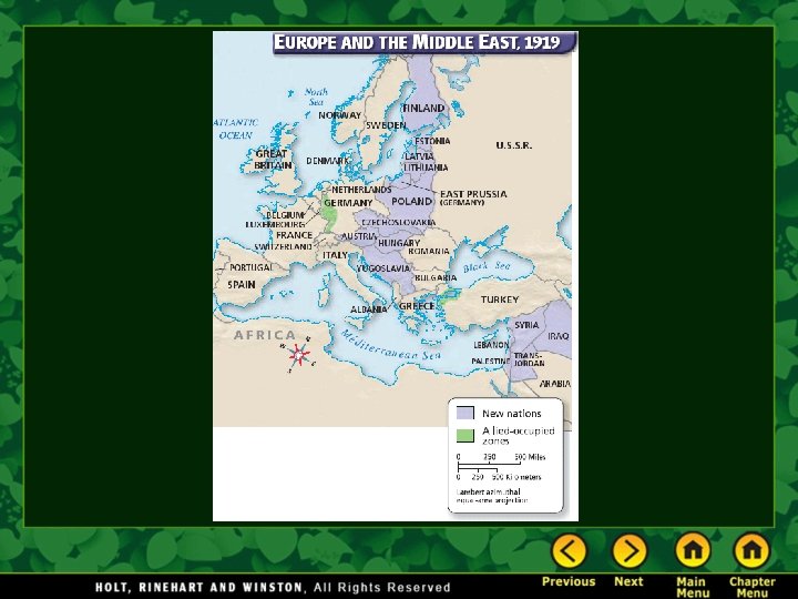 The Treaty of Versailles • The Allies eventually reached an agreement and presented the Treaty of Versailles to Germany in May. • The treaty was harsher than Wilson wanted, requiring Germany to – Disarm its military forces – Pay $33 billion in reparations, or payments for damages and expenses caused by the war, which Germany could not afford – Take sole responsibility for starting the war • The Central Powers also had to turn over their colonies to the Allies, to stay under Allied control until they could become independent. • The treaty included some of Wilson’s Fourteen Points, such as the creation of a League of Nations and self-determination for some ethnic groups in Eastern and Central Europe. Germany strongly protested the treaty but signed it after France threatened military action.