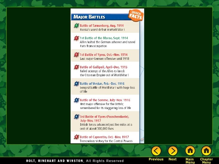 New Weapons of War Poisonous Gas Tanks Airplanes • German military scientists experimented with gas as a weapon. • Both sides used planes to map and to attack trenches from above. • Gas in battle was risky: Soldiers didn’t know how much to use, and wind changes could backfire the gas. • When soldiers began to carry gas masks, they still faced a stalemate. • British forces soon developed armored tanks to move into no-man’s-land. • Then Germans threw canisters of gas into the Allies’ trenches. • These tanks had limited success because many got stuck in the mud. • Many regretted using gas, but British and French forces began using it too, to keep things even. • Germans soon found ways to destroy the tanks with artillery fire. • Planes first dropped brinks and heavy objects on enemy troops. • Soon they mounted guns and bombs on planes. • Skilled pilots sought in air battles called dogfights. • The German Red Baron downed 80 Allied planes, until he was shot down.