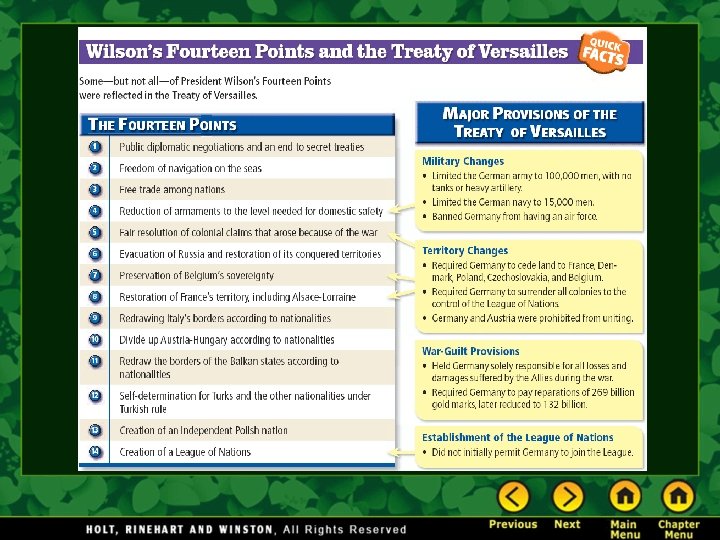 The Fourteen Points • In a speech to Congress before the war ended, President Wilson outlined a vision of a “just and lasting peace. ” • His plan was called the Fourteen Points, and among its ideas were — Open diplomacy, freedom of the seas, the removal of trade barriers, and the reduction of military arms — A fair system to resolve disputes over colonies — Self-determination, or the right of people to decide their own political status and form their own nations — Establishing a League of Nations, or an organization of countries working together to settle disputes, protect democracy, and prevent future wars • The Fourteen Points expressed a new philosophy that applied progressivism to U. S. foreign policy. • The Fourteen Points declared that foreign policy should be based on morality, not just on what’s best for the nation.