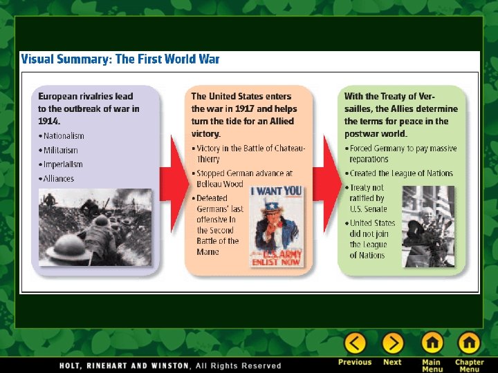 Chapter 18 – The First World War Section Notes Video A World Crisis The United States in World War I The Home Front Peace without Victory The First World War Maps Fighting in the Trenches Alliances, 1914 World War I, 1914– 1917 World War I, 1917– 1918 Europe and the Middle East, 1915 Europe and the Middle East, 1919 Quick Facts Images History Close-up Major Battles Wilson’s Fourteen Points and the Treaty of Versailles Visual Summary: The First World War Wilson Campaign Truck Harlem Hell Fighters War Bonds Infantry Troops in France