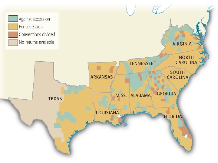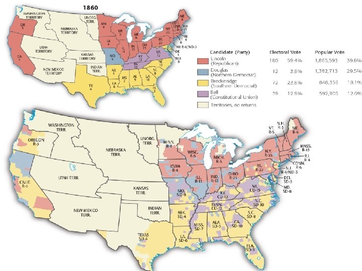 XIV. The Electoral Upheaval of 1860 Lincoln Douglas E. C. 180 12 Pop 1, 865, 593 1, 382, 713 Breckenridge 72 846, 356 • Lincoln wins the 1860 election – Lincoln was a minority president (39. 7%) Bell 39 592, 906