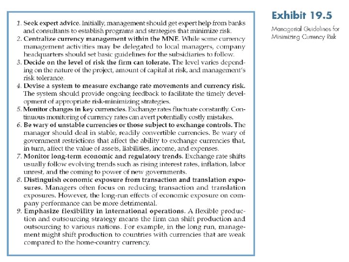 Task Five: Currency Risk Management • Currency risk: the peril resulting from adverse unexpected fluctuations in exchange rates. • Exporters and licensors face currency risk because foreign buyers pay in their own currencies. • Foreign direct investors face currency risk because they receive both payments and incur obligations in foreign currencies. • Managers of foreign investment portfolios face currency risk as the value of stocks fluctuate. International Business: Strategy, Management, and the New Realities 18