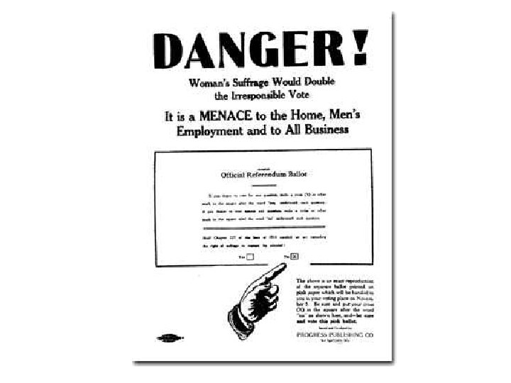 Progressives • Wanted reform of Government Business Quality of Life • Not concerned about women’s suffrage