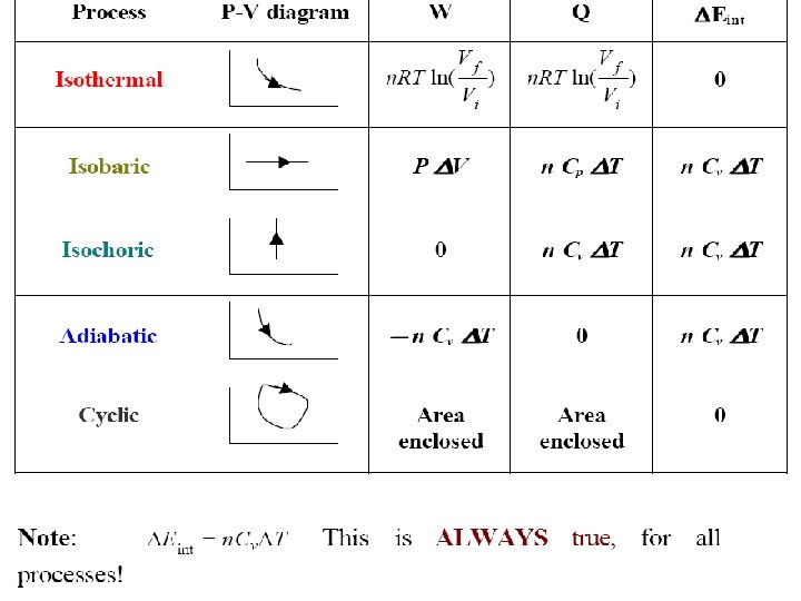Internal energy of monatomic, diatomic, and polyatomic gases (theoretical values) Monatomic gas Diatomic gas Polyatomic gas Degrees of freedom Cv Eint=n CVT Cp=Cv+R (translational + rotational) (3/2) R (3/2) n. RT 5/2 R 3 = 12. 5 (5/2) R = 20. 8 (5/2) n. RT 7/2 R 5 (6/2) R = 24. 9 (6/2) n. RT 8/2 R 6 Eint=n CV T