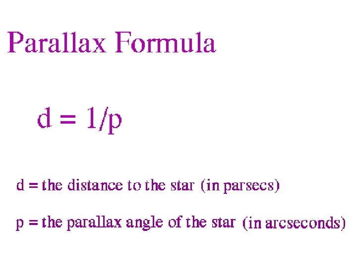 The farther away a star is the smaller the angle becomes, so: distance (in parsecs) = 1/parallax (in arc seconds)