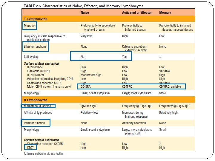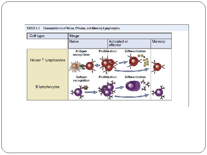 Naive Lymphocytes v Are mature T or B cell emigrants from generative lymphoid organs that have never encountered foreign antigen. v Naive lymphocytes are found in the circulation and peripheral lymphoid organs. v Naive and memory lymphocytes are both called resting lymphocytes because they are not actively dividing, nor are they performing effector functions. v Die after 1 to 3 months, if they do not recognize antigens. v Cytokines are also essential for the survival of naïve lymphocytes. The most important of these cytokines are IL-7 and B cell–activating factor (BAFF), which are required for naive T and B cell survival, respectively.