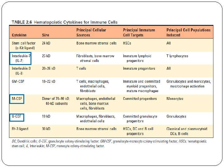 Bone Marrow v The bone marrow is the site of generation of circulating blood cells, including red blood cells, granulocytes, and monocytes, and the site of B cell maturation. v Hematopoiesis occurs initially during fetal development in the yolk sac, then shifts to the liver between the third and fourth months of gestation, and finally shifts to the bone marrow. v Red blood cells, granulocytes, monocytes, dendritic cells, mast cells, platelets, B and T lymphocytes, and ILCs all originate from a common hematopoietic stem cell (HSC) in the bone marrow. v HSCs are multipotent and self-renewing cells. v The proliferation and maturation of precursor cells in the bone marrow are stimulated by cytokines (colony-stimulating factors ). v Hematopoietic cytokines are produced by stromal cells and macrophages in the bone marrow.