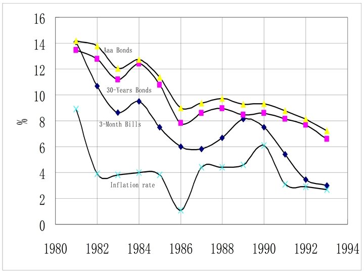 Table 2 -7 Interest Rate Level and Inflation Rates 1981 -1995 3 -Month Treasury Bills 30 -Year AAA Rated Treasury Bonds Corporate Bonds Inflation rate 1981 14. 08 13. 44 14. 17 8. 9 1982 10. 69 12. 76 13. 79 3. 9 1983 8. 63 11. 18 12. 04 3. 8 1984 9. 52 12. 39 12. 71 4. 0 1985 7. 49 10. 79 11. 37 3. 8 1986 5. 98 7. 80 9. 02 1. 1 1987 5. 82 8. 58 9. 38 4. 4 1988 6. 68 8. 96 9. 71 4. 4 1989 8. 12 8. 45 9. 26 4. 6 1990 7. 51 8. 61 9. 32 6. 1 1991 5. 42 8. 14 8. 77 3. 1 1992 3. 45 7. 67 8. 14 2. 9 1993 3. 02 6. 59 7. 22 2. 7