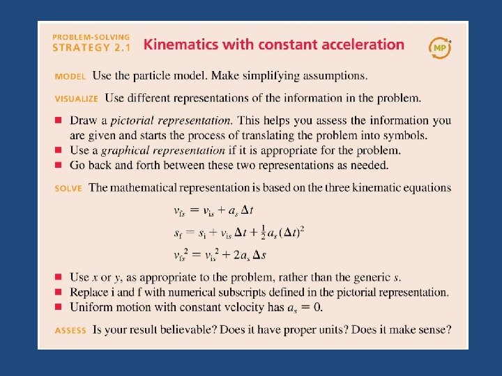 Kinematic Equations The coordinate s is a general coordinate. We can replace s with x or y if our motion is horizontal or vertical, respectively. If the acceleration is not constant, we need to: 1. Break the problem up into parts with constant acceleration 2. Use another method (calculus, graphs).