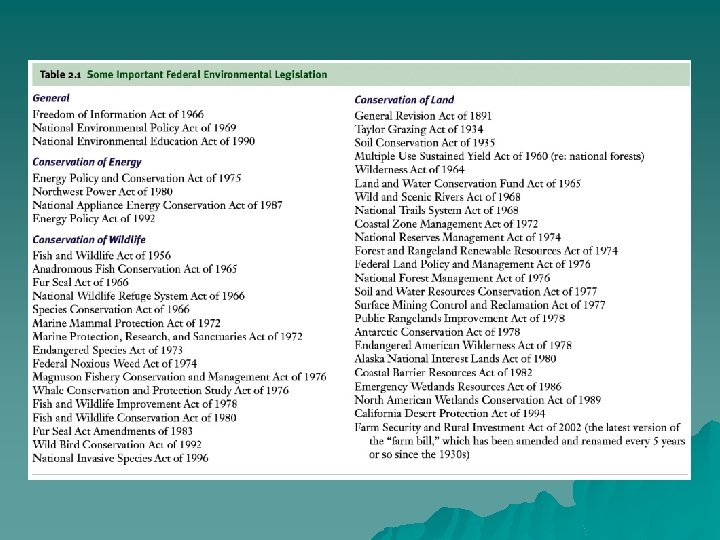 Overview of Chapter 2 o o o US Environmental History US Environmental Legislation Economics and the Environmental Problems in Central and Eastern Europe Environmental Ethics, Values and Worldviews