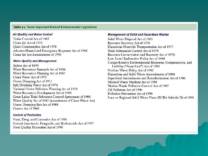 US Environmental Legislation o o Numerous laws passed since 1970 They address: • • • Clean water Clean air Energy conservation Hazardous waste Pesticides Federal regulation of pollution