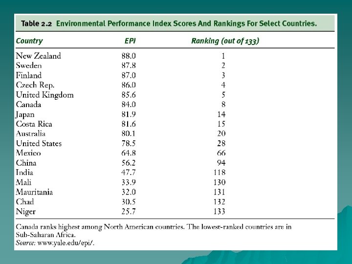 National Income Accounts o Estimates of National Economic Performance and used in Politics • • o o Gross Domestic Product (GDP) Net Domestic Product (NDP) Environment may be overexploited to yield a higher GDP in developing countries EPI (Environmental Performance Index) • Assesses a country’s commitment to environmental and resource management