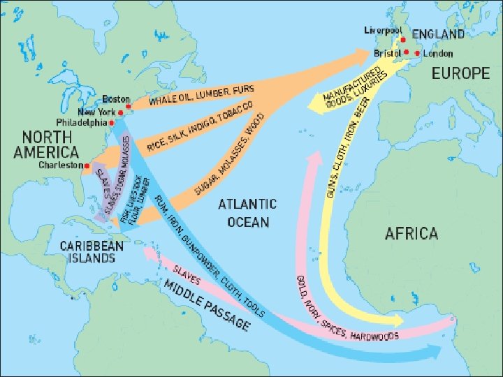 – Africans brought to the Americas to be sold as slaves. – Americans with the use of slaves, produce sugar, tobacco, and rice to Europe. – Ships carrying European good to Africa in exchange for slaves Triangular Trade