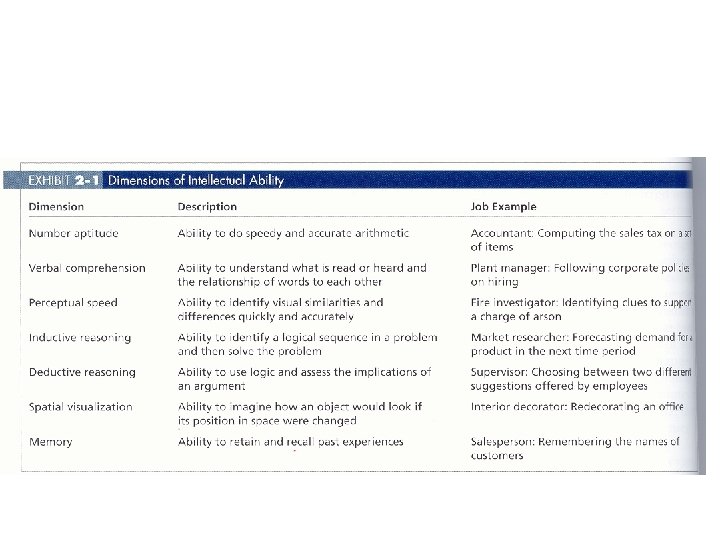 Intellectual Ability • Thinking, reasoning, and problem solving – Information procession • Basic dimensions of intellectual abilities – – – – Aptitude Verbal comprehension Perceptual speed Inductive reasoning Deductive reasoning Spatial visualization Memory