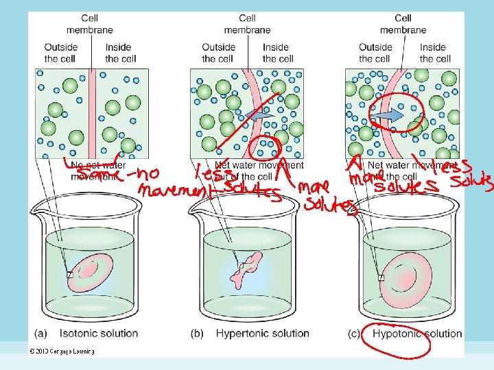 Cell membrane Outside Inside the cell No net water movement (a) Isotonic solution Cell membrane Outside Inside the cell Net water movement out of the cell (b) Hypertonic solution Net water movement into the cell (c) Hypotonic solution Stepped Art Fig. 2 -4, p. 19