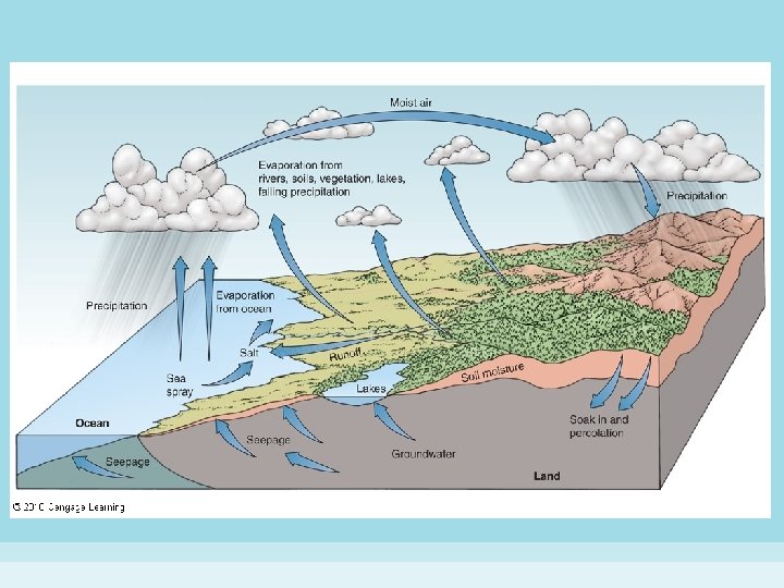 Moist air Evaporation from rivers, soils, vegetation, lakes, falling precipitation Precipitation Evaporation from ocean Salt Sea spray Runo ff ure Lakes ist o m Soil Ocean Seepage Precipitation Seepage Groundwater Soak in and percolation Land Stepped Art Fig. 2 -20, p. 36