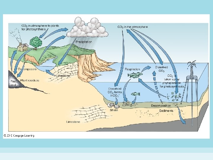 CO 2 in atmosphere to plants for photosynthesis CO 2 in the atmosphere Precipitation Respiration Decomposers Limestone Peat Plant residues coal Dissolved CO 2 forms HCO 3– Shells Dissolved CO 2 is taken up by phytoplankton for photosynthesis Decomposition Sediments Limestone Stepped Art Fig. 2 -21, p. 37