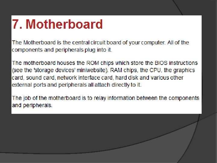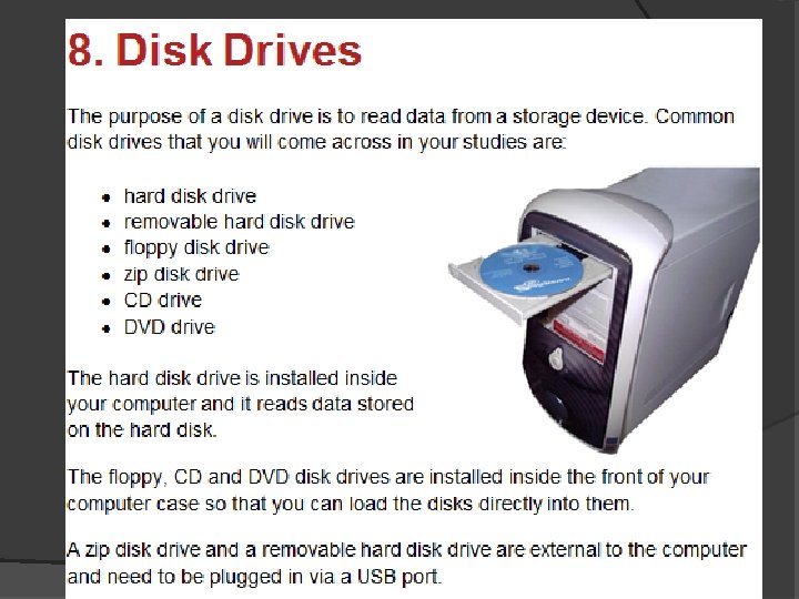 Hard Disk Typical size = 120 GB Advantages • Main Backing storage for files and programs • Can store lots of data compared to the floppy disc • Can have a second hard disk as Back-up storage Disadvantages • Slow to access when compared to ram • Data can Be damaged if the head crashes onto the platter