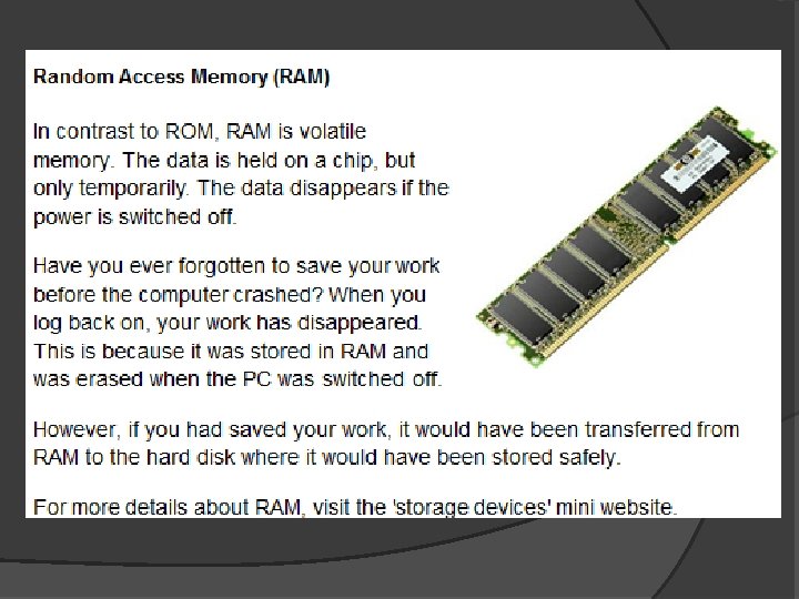 ROM The instructions to start the computer are stored on this This sort of memory is non-volatile memory RAM Programs and data stored on RAM are lost when a computer is switched off. This memory is volatile memory