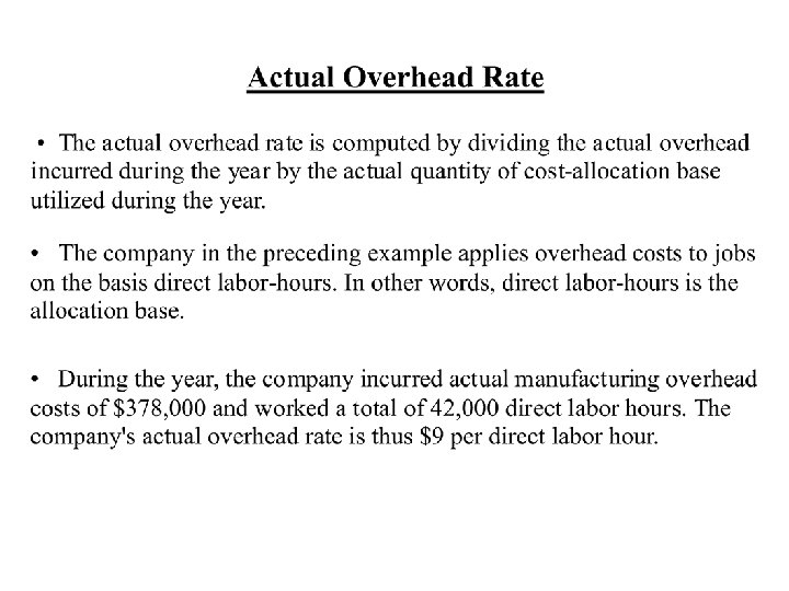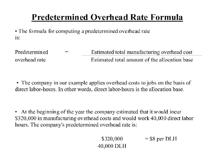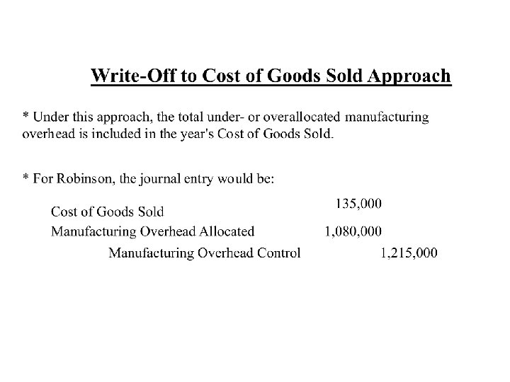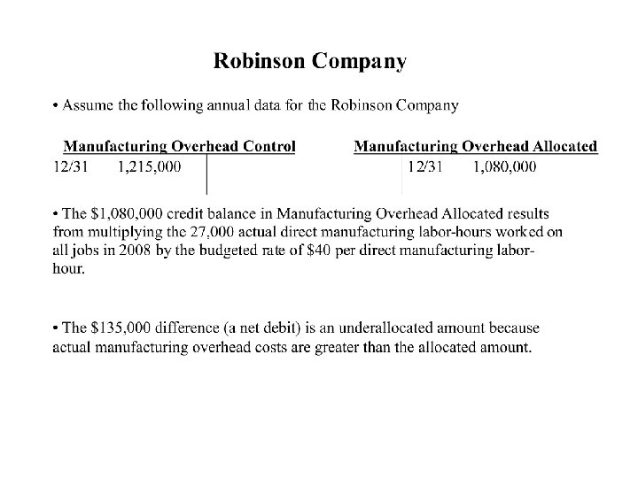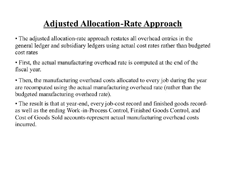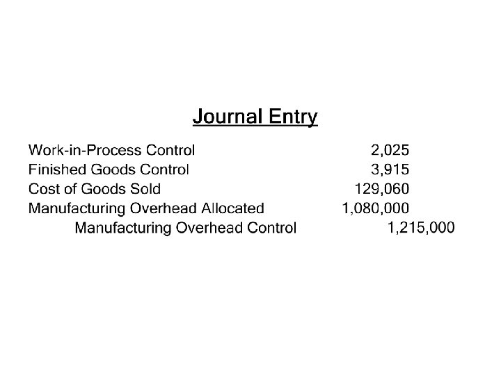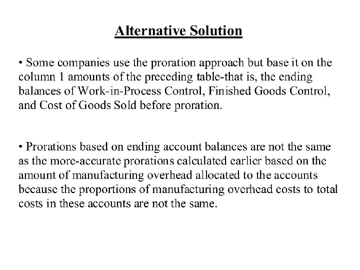 Allocation Account Work in Process control Finished goods control Cost of goods sold Total Account Balance (Before Proration) $ 50, 000 Allocated Manufacturing Overhead Allocated Included in Each Manufacturing Account Balance Overhead Included in Proration of $135, 000 of Underallocated (Before Each Account Balance Proration) as a Percent of Total Manufacturing Overhead 16, 200 1. 50% 0. 015 x $135, 000= 75, 000 31, 320 2. 90% 0. 029 x $135, 000= 3, 915 78, 915 2, 375, 000 1, 032, 480 95. 60% 0. 956 x $135, 000= 129, 060 2, 504, 060 1, 080, 000 100. 00% $135, 000 $2, 635, 000 $2, 500, 000 $ $ $ 2, 025 Account Balance (After Proration) $ 52, 025