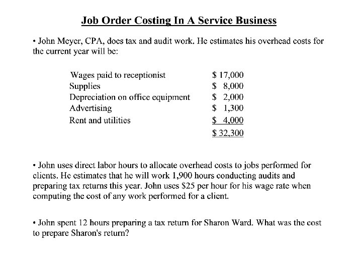 Types of Product-Costing Systems Process Costing Job-Order Costing F Typical job-order cost applications: v Special-order printing v Building construction F Also used in service industry v Hospitals v Law firms