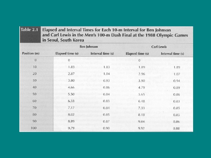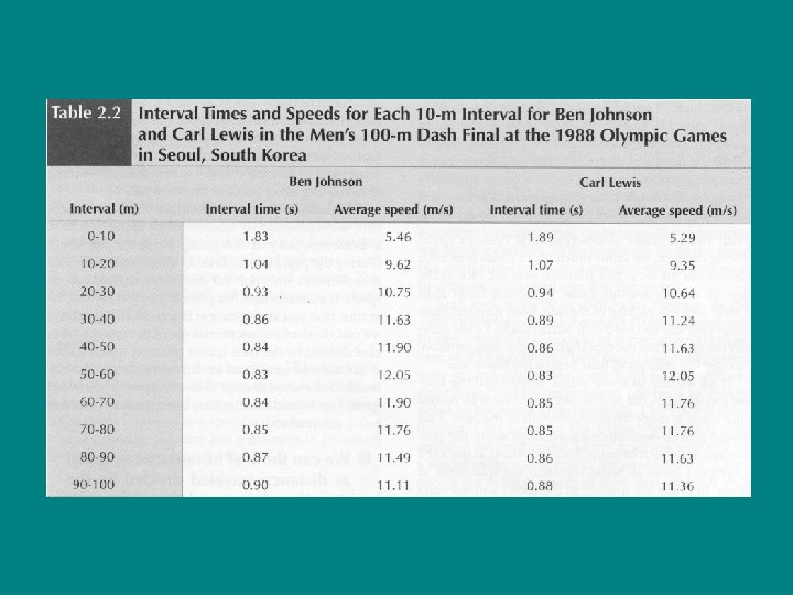 Speed and Velocity • • Johnson: Average speed entire 100 m s = 100 m/9. 79 s s = 10. 21 m/s • • Lewis: Average speed entire 100 m s = 100 m/9. 92 s s = 10. 08 m/s • Average speed first 50 m • s = 50 m/5. 50 s • s = 9. 09 m/s • Average speed first 50 m • s = 50 m/5. 65 s • s = 8. 85 m/s • • Average speed 50 m to 100 m s = 100 m-50 m/9. 79 s – 5. 50 s = 50 m/4. 29 s s = 11. 66 m/s Average speed 50 m to 100 m s = 100 m-50 m/9. 92 -5. 65 s = 50 m/4. 27 s s = 11. 71 m/s