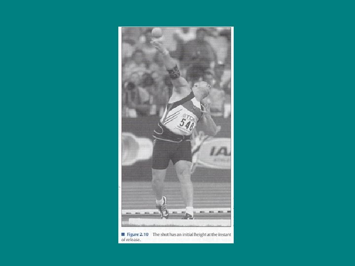 Projectiles in Sport • Horizontal displacement—Dependent on initial horizontal velocity, initial vertical velocity, and initial height – Shot put, hammer throw, discuss throw, javelin throw, and long jump – Javelin and discuss can be affected by air resistance so equations may not be accurate – Maximum horizontal displacement will occur if the horizontal and vertical components of the initial velocity are equal, or when the projection angle is 45° (assuming initial release height is zero) – The higher the release height and the greater the lift effects of air resistance on the projectile, the farther below 45° the projection angle should be (shot put 35°)