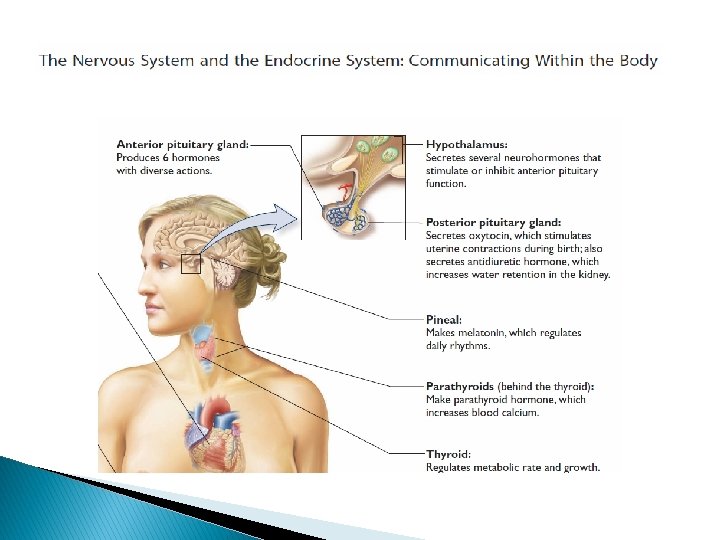 The Endocrine System � Endocrine system: a chemical communication network that sends messages throughout the body via the bloodstream. � Hormones: chemicals that circulate through the blood and regulate the functioning or growth of the body. � Pituitary Gland: the major component of the endocrine system, or “master gland, ” which secretes hormones that control growth and other parts of the endocrine system.