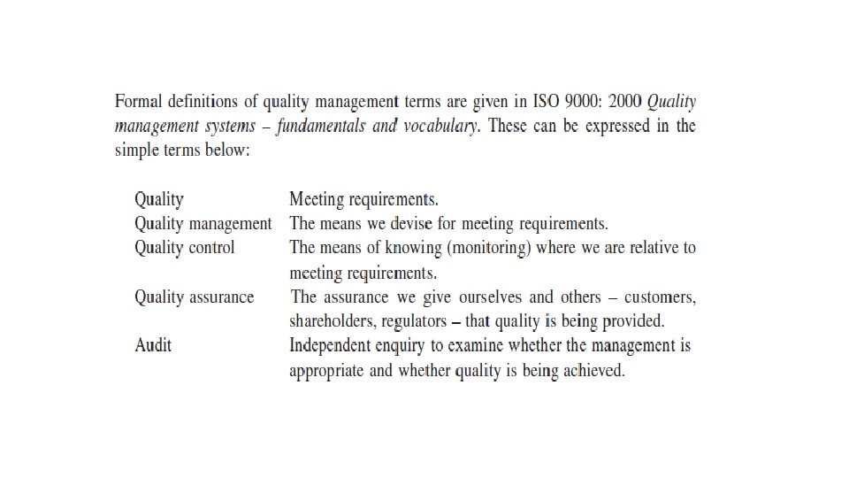 Quality Management § The degree of excellence of something. (Oxford Dictionary) Definitions of Quality § Conformance to customer’s requirements. (Philip B Crosby ) § Fitness for purpose. (Gunter Zietlow ) § Ability to satisfy stated and implied needs. (British Standard, BS 4778) § How well a set of inherent characteristics comply with set of requirements? ISO 9000, 9001, 9004 However, what satisfies customers today may not be satisfying