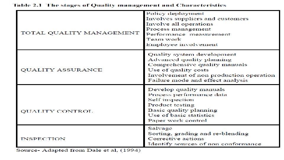 Definition of quality from different perspectives • For Engineers: quality is conformance to specifications • From manufacturing point of view: quality is fitness for use (Juran). • From customer point of view: Quality means fitness for use and meeting customer satisfaction. • From process point of view: Quality means conformance with the process design, standards and specifications. • From product point of view: Quality means the degree of excellence at an acceptable price. Quality is all about reducing variations: precision and accuracy of production. There are natural (unavoidable variation) and assignable (avoidable, caused simply by mistake and random) variations (Deming).