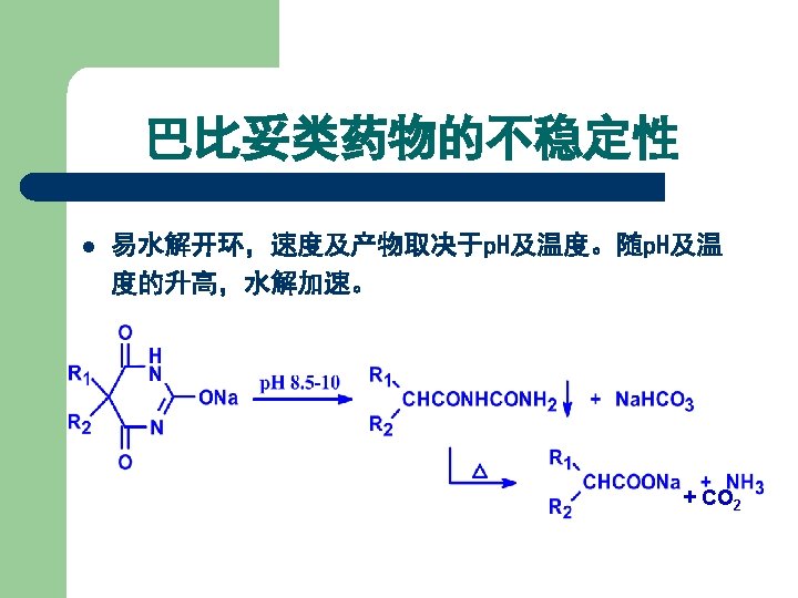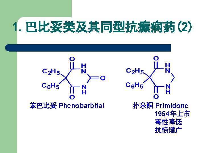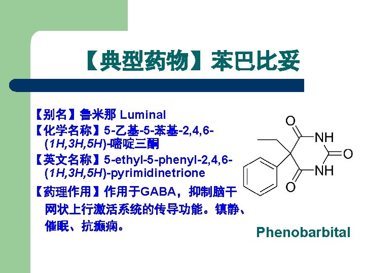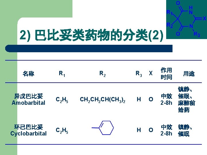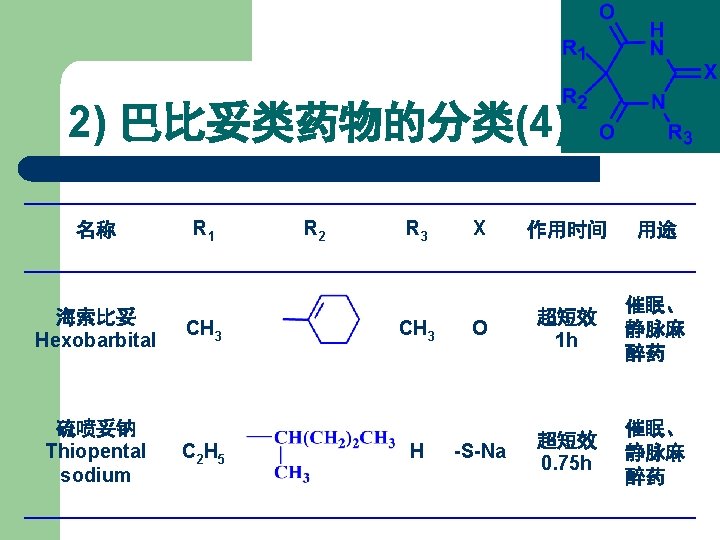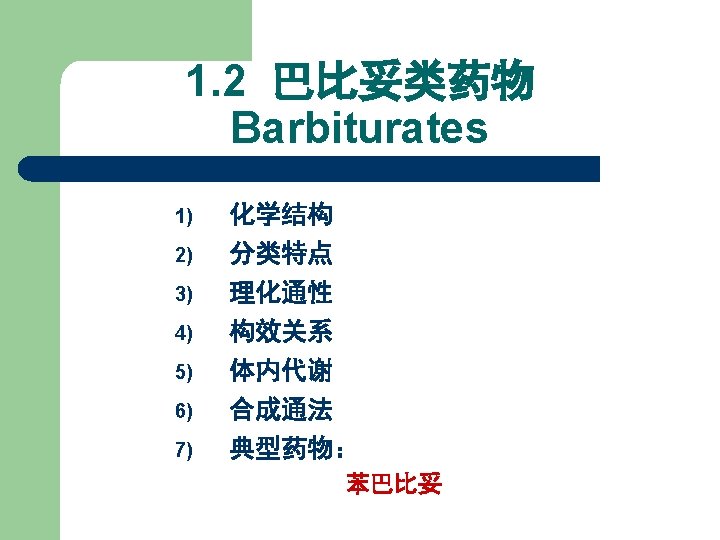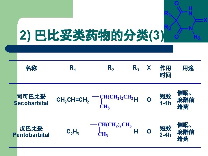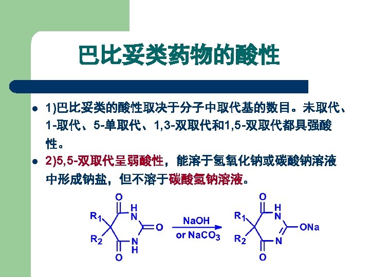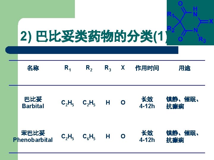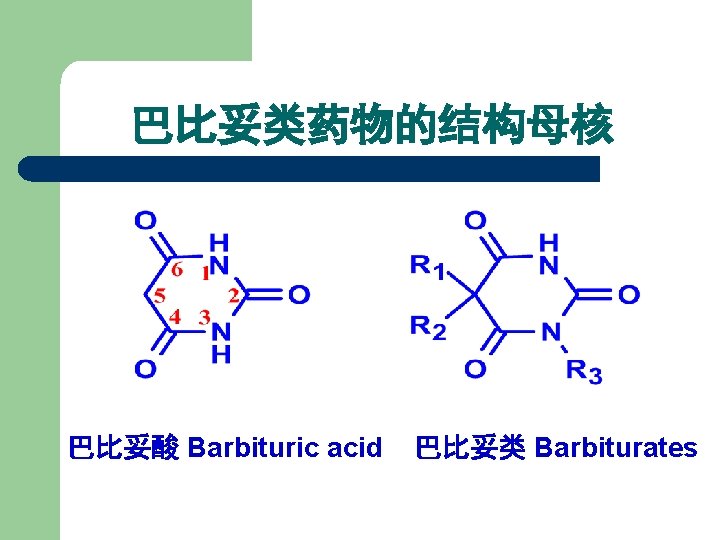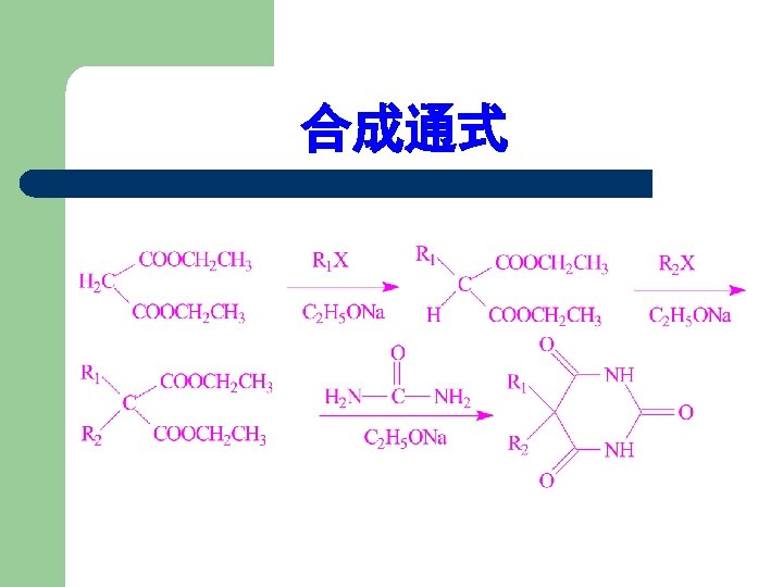 1. 2 Barbiturates 1) 巴比妥类药物的化学结构 丙二酰脲 General Formula of Chemical Structures of Barbiturates Belong to Pyrimidine family