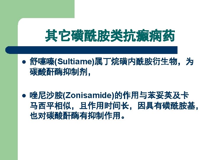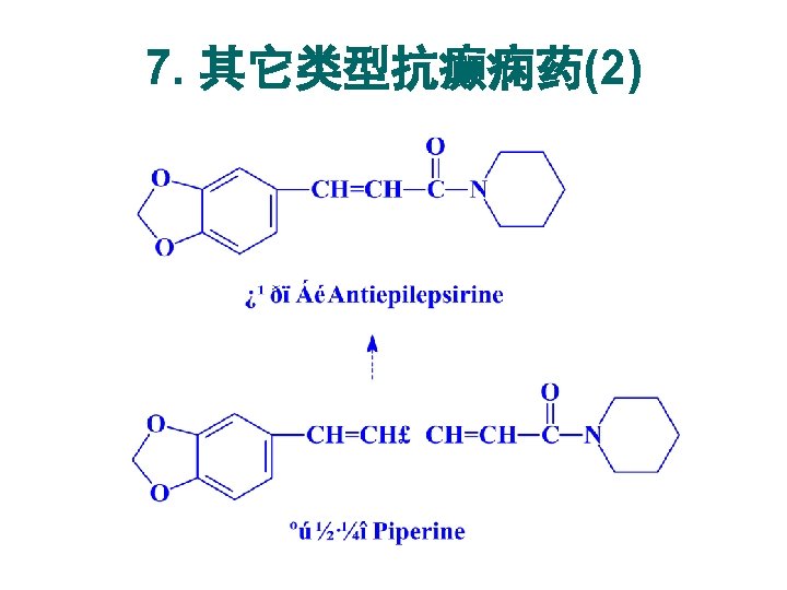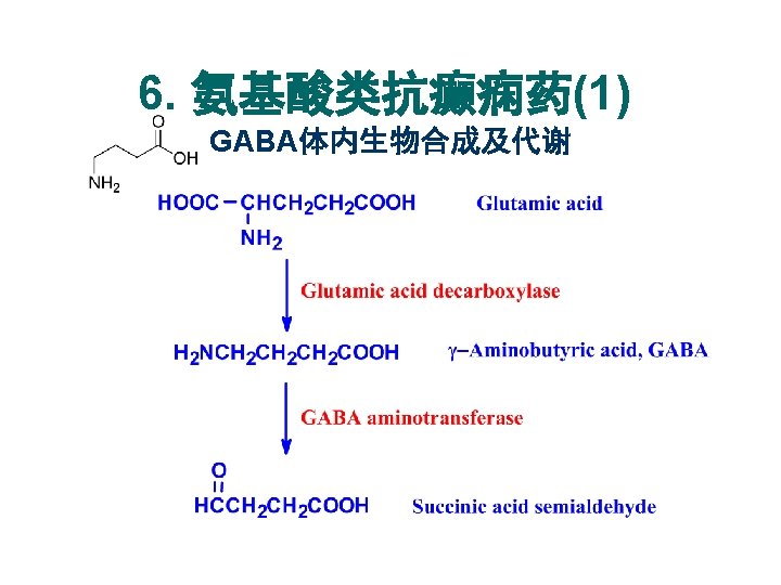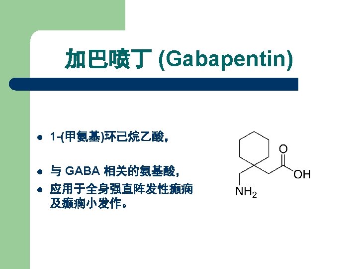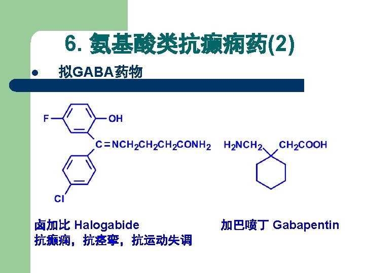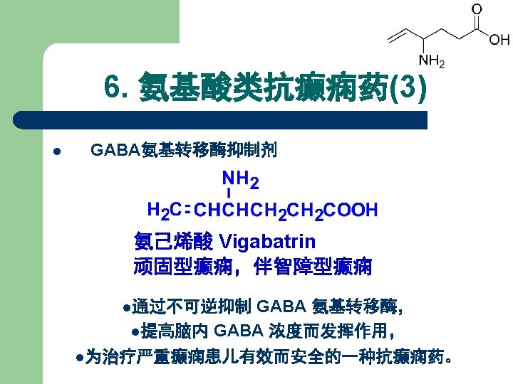 5. 脂肪羧酸类抗癫痫药 丙戊酸钠 丙戊酰胺 Sodium valproate Valpromide: 1978年,广谱低毒 为广谱抗癫痫药 增加脑内GABA浓度 Carboxylate acid derivatives