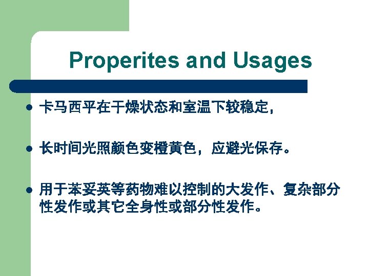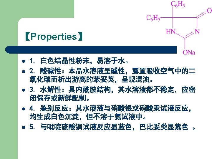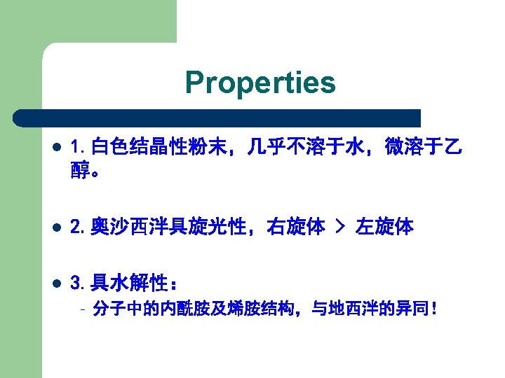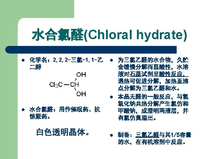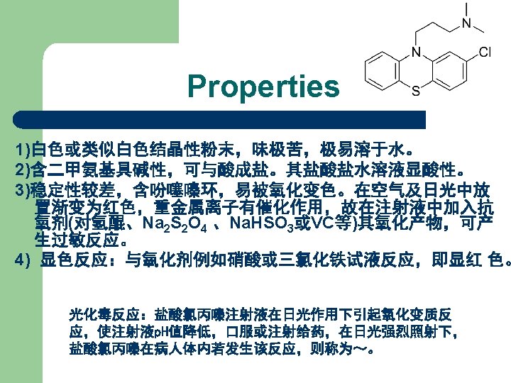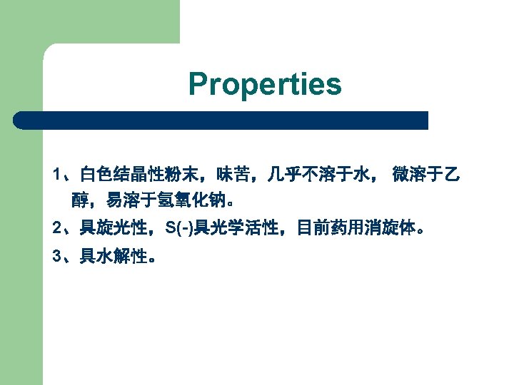 Properties l White crystal or powder, mp 147 -149℃. l Soluble in chloroform, slightly soluble in ethanol, sparsely soluble in ethyl ether, not soluble in water.