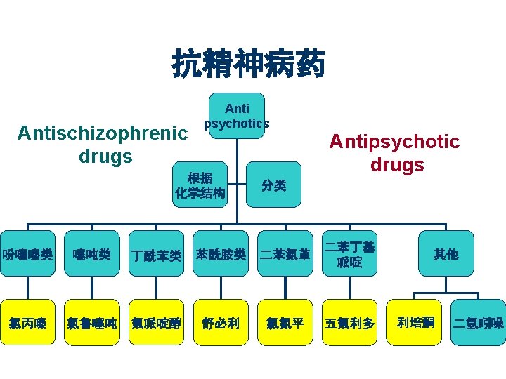 Classification-1 Antipsychotics By mechanism 抗精神病药 抗抑郁药 Antipsychotic Antidepressant Drugs drugs Classification 抗焦虑药 抗躁狂药 Antianxiety drugs Antimanic drugs