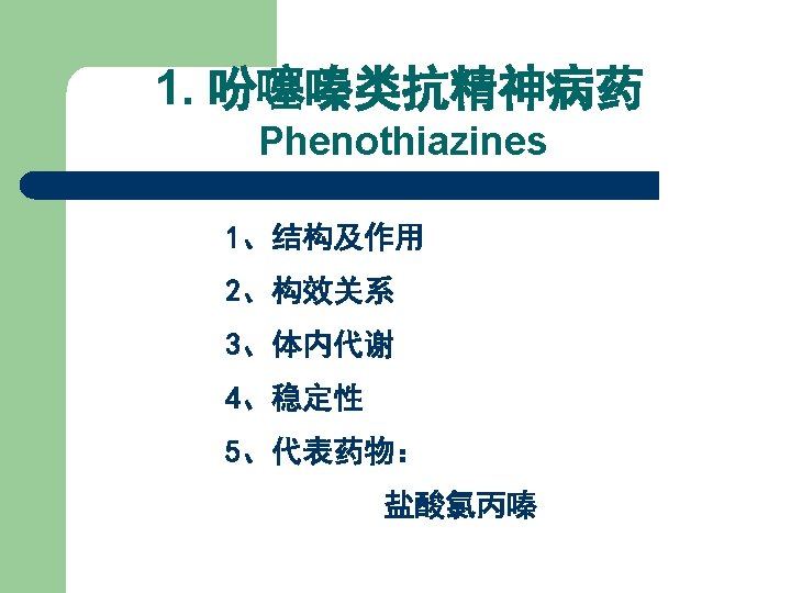 Section III Antipsychotics Psychotherapeutic drugs l l 抗精神失常药作用简介: 阻断脑内多巴胺受体,治疗神 经系统的功能亢进,导致运动 障碍。 l Alternative names: l Antipsychotics; Depres Anti-psychiatric disorders drugs; sion Psychotherapeutic drugs; Neuroleptics. l l l Schyso phrenia Clinical usage Anxiety