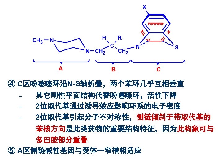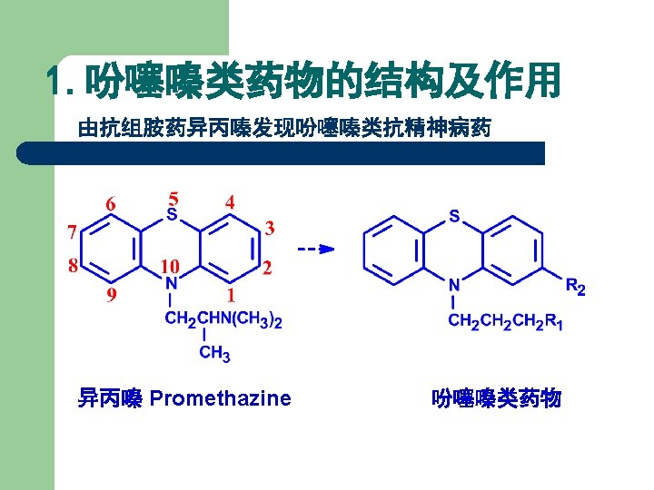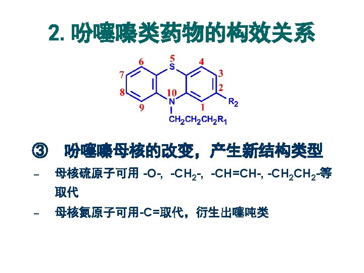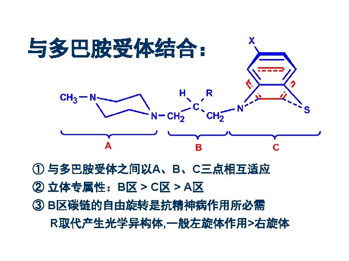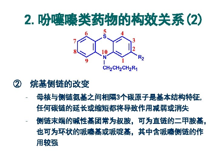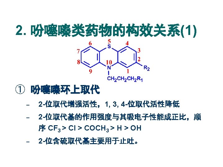 药名 R 1 R 2 作用强度 氯丙嗪 Chlorpromazine 乙酰丙嗪 Acetylpromazine N(CH 3)2 Cl 1 N(CH 3)2 COCH 3 <1 三氟丙嗪 Triflupromazine N(CH 3)2 CF 3 4 奋乃静 Perphenazine Cl 10 氟奋乃静 Fluphenazine CF 3 50