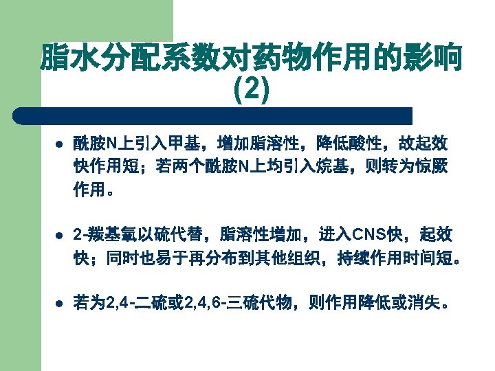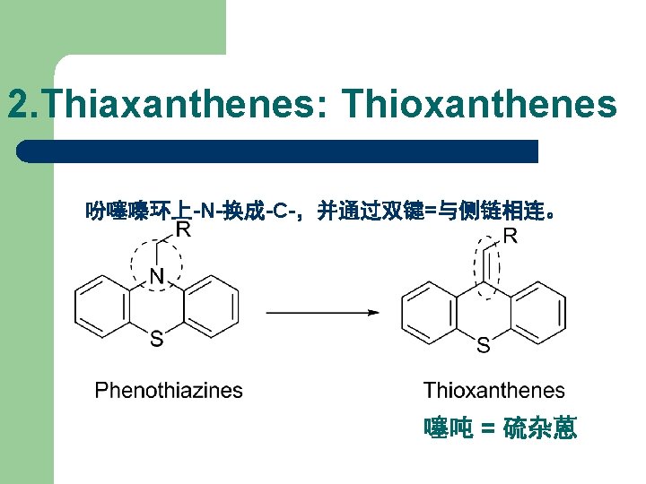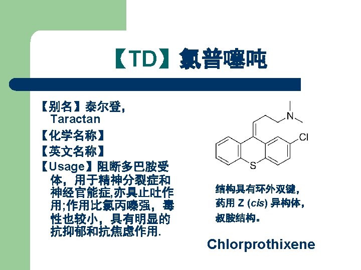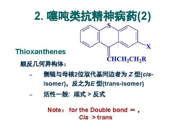 2. 噻吨类抗精神病药(1) Thioxanthenes 药名 R X 氯普噻吨 Chlorprothixene N(CH 3)2 Cl 氨砜噻吨 Thiothixene SO 2 N(CH 3)2 氟哌噻吨 Flupenthixol CF 3 珠氯噻醇 Zuclopenthixol Cl