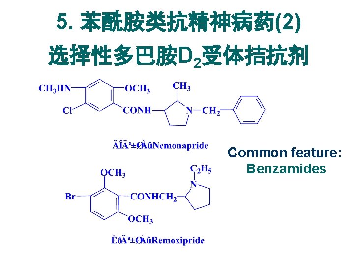 5. 苯酰胺类抗精神病药(1) 选择性多巴胺D 2受体拮抗剂 Benzamides 能止吐并抑制胃液分泌 具有镇痛作用 l. Common features: l具有与氯丙嗪相似的抗精神病效能. This type of drug was discovered in 70’, during the structure modification of procaine.