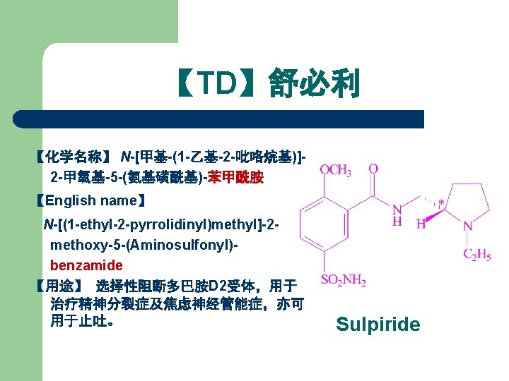 Synthesis Materials of Sulpiride l 1) N-乙基-2 -胺甲基吡咯烷 l 2) Salicylic acid l 3) (CH 3)2 SO 4 l 4) HOSO 2 Cl N-Ethyl-2 -aminomethyl pyrolane