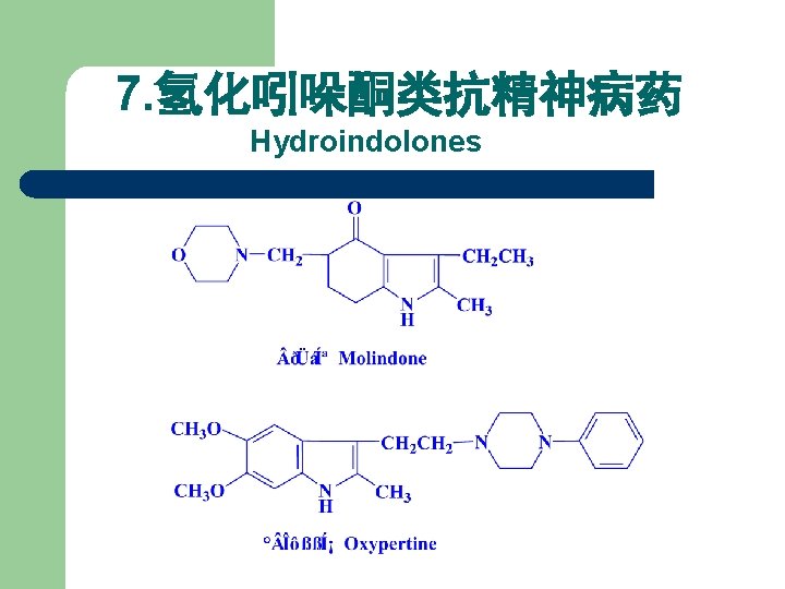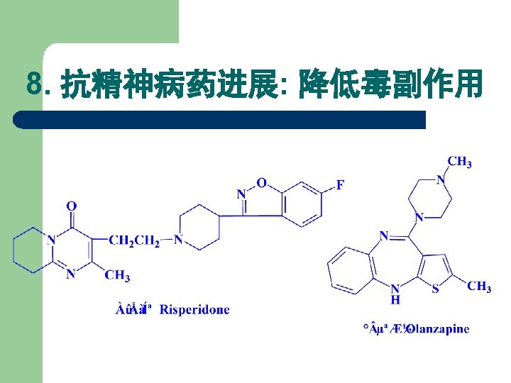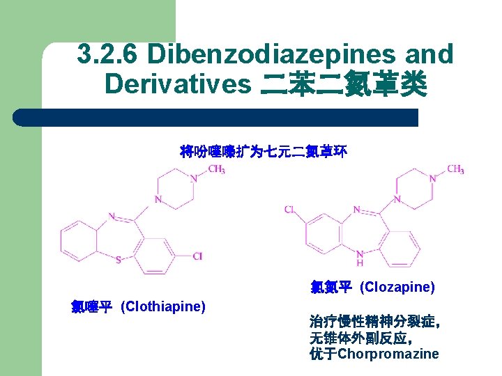 6. 二苯并氮杂䓬类和二苯并氧氮䓬类 Dibenzodiazepines and Dibenzoxazepines X NH S R 1 H Cl R 2 Cl H R 3 CH 3 洛沙平 Loxapine O Cl H CH 3 阿莫沙平 Amoxapine O Cl H H 药名 氯氮平 Clozapine 氯噻平 Clothiapine